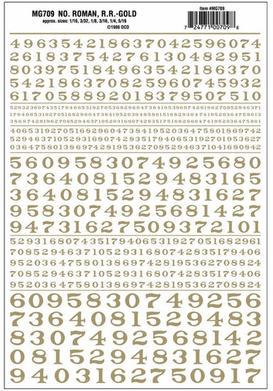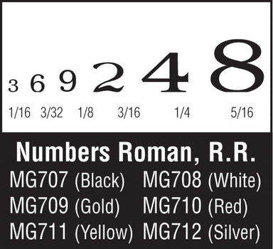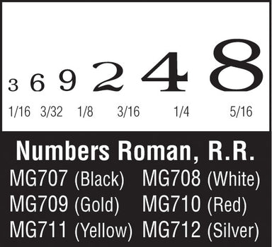 Numbers Roman R.R. Gold Package contains one sheet. Sheet size: 5 5/8 in x 8 1/4 in (14.2 cm x 20.9 cm) Letter sizes: 1/16 in, 3/32 in, 1/8 in, ...