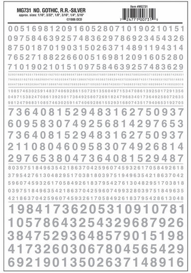 Numbers Gothic R.R. Silver Package contains one sheet. Sheet size: 5 5/8 in x 8 1/4 in (14.2 cm x 20.9 cm) Letter sizes: 1/16 in, 3/32 in, 1/8 i...