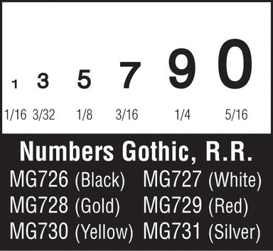 Numbers Gothic R.R. Gold Package contains one sheet. Sheet size: 5 5/8 in x 8 1/4 in (14.2 cm x 20.9 cm) Letter sizes: 1/16 in, 3/32 in, 1/8 in,...