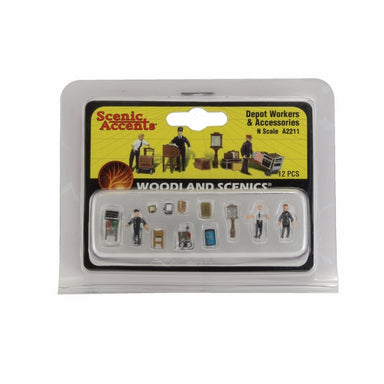 Depot Workers & Accessories - N Scale The conductor reviews the passenger manifest at the check-in podium while two workers maneuver dollies l...