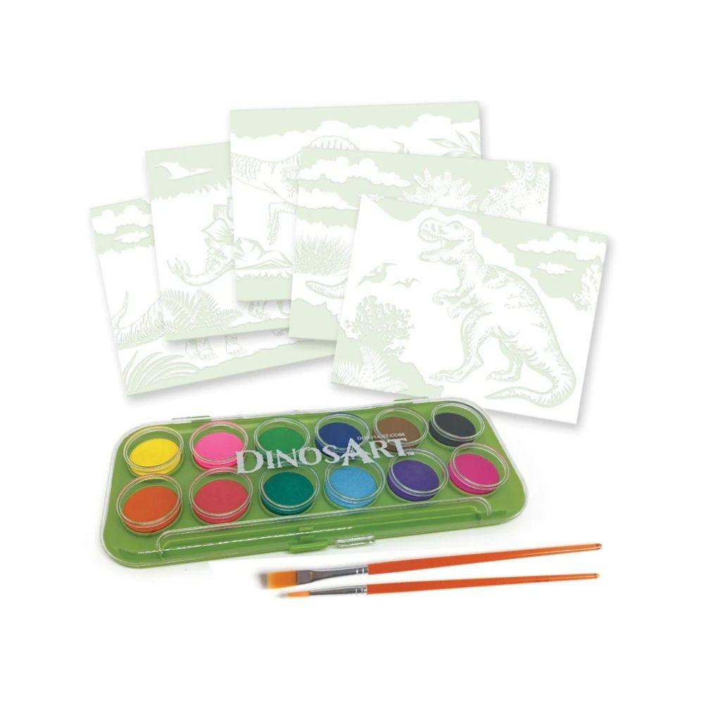 DinosArt Magic WatercolourMagically paint 5 beautiful canvases.The glow in the dark pre-varnished line art helps the watercolor stay in the right areas.Your artistic masterpiece will shine in the dark!Features • 5 magic watercolor boards • 12-color watercolor set • 2 paintbrushes • Collectible dinosaur card • Colour instructions