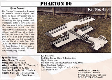 BALSA USA Kit No 450 PHAETON 90, 1778mm WINGSPANThe Phaeton 90 was designed around the new powerful 4-stroke engines. The flight performance is abs...