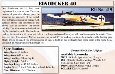 BALSA USA KIT 419 EINDECKER 40 German World War I FighterOur Eindecker 40 kit has been engineered for your success. There are dozens of precision ...
