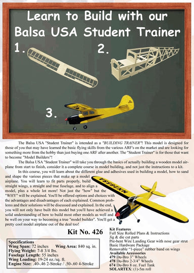 BALSA USA KIT No. 426 STUDENT TRAINER 1830mm WINGSPAN The Balsa USA "Student Trainer" is intended as a "BUILDING TRAINER"! This model is designed f...