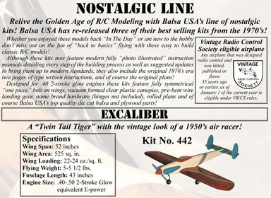 BALSA USA$186.99| /No reviewsBALSA USA KIT No.442 EXCALIBER 1320mm WINGSPANA "Twin Tail Tiger" with the vintage look of a 1950's air racer!Whether you enjoyed these models back...