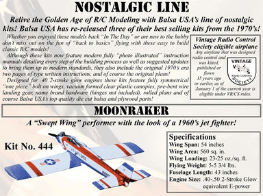 BALSA USA$175.99| /No reviewsBALSA USA Kit No. 444 MOONRAKER 1372mm WINGSPANA "Swpet Wing" performer with the look of a 1960's Jet Fighter!Whether you enjoyed these models back...
