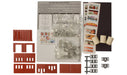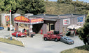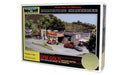 Full-service is alive and well on your layout! Vintage service station includes more than 130 details including, tow truck, wrecked car, billboard, tire rack and tires, soda machine, 2-pump island, tire changer, sign lights, gas station sign, fork lift, dolly, compressor, solo gas pump, small kerosene tank, dry transfer decals and more. See photos for footprint.