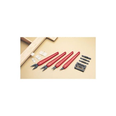 #216 - Centers & guides for perfectly aligned slots for any hinge. (3) blades fit #2 X-Acto handle. (3) snap-on jig guides and (1) balsa picker...