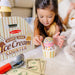Scoop up some cool treats with this all-inclusive, 28-piece pretend play ice cream counter! The sturdy wooden tabletop counter holds eight wooden scoops of different-flavored ice cream, six assorted toppings, two cones, a plastic cup, an ice cream scooper, tongs, and a wooden spoon. The scooper fits into a hole on top of the scoops to lift, stack, and release. Take orders on the reusable menu card, pay with play money, and serve up delicious fun!