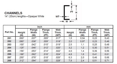 Contains Eight .100" X .250" X 24" OPAQUE WHITE POLYSTYRENE STRIP .100" X .250" X 24" / 2.5mm X 6.3mm X 60cm