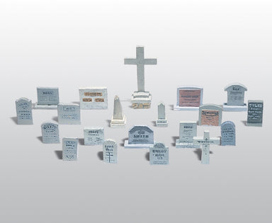 20 Tombstones HO Scale Kit Add these 20 tombstones to your layout. If your name is on one, it is mere coincidence. There are rectangular, square a...