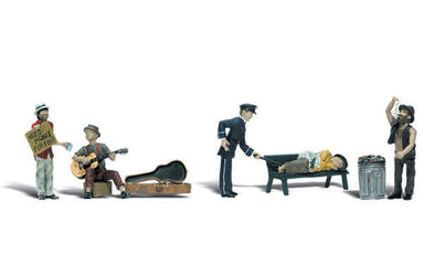 Hobos - HO Scale WS-A1860A man sits, one plays his harmonica, another sits on a crate, another man roasts a hot-dog and the fifth stands with his k...