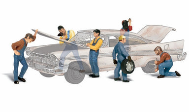 Auto Mechanics - HO Scale WS-A1914One auto mechanic welds and another wrenches while two change a tire, another drills and one supervises. Set cont...
