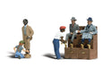 A set of five figures and a small and large shoe shiner box. One man sits for a shine, while another waits on the box. The shoe shiner is engaging his customers in conversation, while nearby a small boy shines a man's shoes.