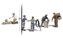 One man has shimmied up a utility pole. One has a cable in his hand. Two men pick up trash. One man kneels down and shows something to another man, working in the manhole.