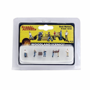 Dock Workers - N Scale One dock worker is holding up his hand to signify stopping an operation. One is opening a crate, one is dragging a pallet, ...