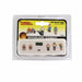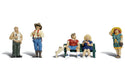 Full Figured Folks - N Scale A man and a woman sit on a park bench. The woman holds her popcorn, while the man is totally unaware that a pudgy pug dog is trying to steal his hot dog. A man clutches his bottle to his belly. Another man observes, with his hands on his suspenders and a woman holds her hat and purse.