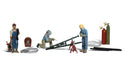A set of men, with protective welding helmets and gloves, working with an assortment of mig and spot welders, a plasma cutter and gas cylinders - complete with angle iron pieces.