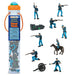 • Size and Color: Each Super TOOB is 13 inches long and two inches wide, a little larger than a standard American ruler. The figures within measure up to three inches in height. The soldiers feature dark blue jackets and hats with light blue pants and black boots and belts. The captain’s horse is dark brown.