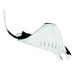 Once believed to be a single species, the Manta genus is now usually separated into two: Manta bistrosis, the giant ocean manta, and Manta alfredi, the reef manta. The oceanic manta is larger, and can measure up to 23 feet wide. The reef manta is a bit smaller, with a maximum wingspan of 18 feet. Aside from size, the oceanic and reef mantas can be told apart by their markings. Reef mantas feature a soft gradient between the white and black markings on their backs, whereas oceanic mantas have sharper, crisp separation between white and black. This figure represents an oceanic manta.