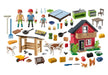 Figures: 1 woman, 1 man, 1 boy Animals: 1 cat, 1 kitten, 1 cow, 1 calf, 2 birds, 2 mice, 1 mole Accessories: 1 farmhouse with greenery, 1 shelter, 1 stove, 1 sink, 2 chairs, 1 table, 1 knife, 1 alarm clock, 3 cups, 1 brush, 1 milk, 2 bottles, 3 green fodder, 1 double bed, 2 pots, 1 teapot, 1 radio, 1 rake, 1 pitchfork, 1 pan, 1 baking tray, 3 plates, 2 screw-top jars, 2 tubes, 2 potted plants, 1 book, 3 boards, 1 feed rack, 2 straw bales, 1 toaster, 1 wheelbarrow, 1 molehill , 1 paper bag, 1 baguette, 1 bundle of straw, 1 bundle of grass