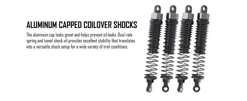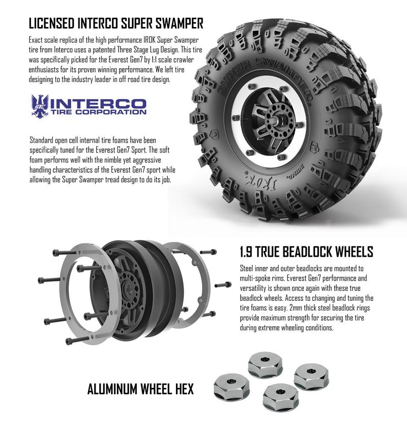 The Gen7 Sport also includes a Hobbywing Brushed ESC, Licensed Interco Super Swamper tires and real beadlock wheels. The modern and stylish 4 door SUV body is available in silver or burnt orange, and is customizable with black, white, red and wood grain die cut decals giving your Gen7 Sport the individuality that expresses your soul. Round this all out with a 2000mAh NiMH battery and charger and a competent 2.4GHz radio system and you can see why the Gen7 Sport is the best value to be had in a scale r/c crawler.