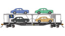 As the demand for automobiles grew in the postwar era, larger dealer shipments and more efficient delivery processes were required. While it had previously been common practice to deliver vehicles in boxcars, this was a cumbersome routine, as loading involved careful maneuvering, and each car could only hold a couple of vehicles. Flatcars were also used, but while loading was more efficient, space per car was still limited. In the mid-1950s, the Frisco Railroad expanded on the latter format by constructing a second level above the flatcar deck, instantly doubling the per-car capacity. Other railroads soon followed with variations of this first iteration of the "autorack" specialized car carrier. Bachmann is pleased to bring this early Auto Carrier to our HO Scale range, complete with four era-appropriate vehicle loads.