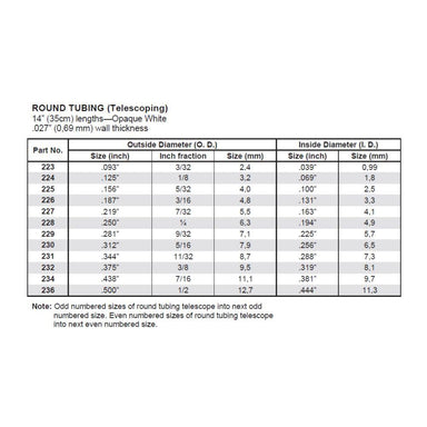 Contains Fifteen .281" (7.1mm) OD OPAQUE WHITE POLYSTYRENE TUBING .281" OD X 14" / 7.1mm X 35cm NOTE: ODD NUMBERED SIZES OF ROUND TUBING TELESCOPE ...