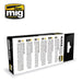 This set includes a leaflet which will teach us how to do this technique with included products: the brand new A.MIG-2016 TRANSPARATOR, necessary for semi-transparent base colors, both MATT BLACK & MATT WHITE for grey tones ranging from charcoal grey for shadows through to light grey for highlights, WASHABLE WHITE & WASHABLE BLACK for weathering dust, spills, chipping, and streaking, and ACRYLIC SATIN VARNISH necessary for protecting our effects.