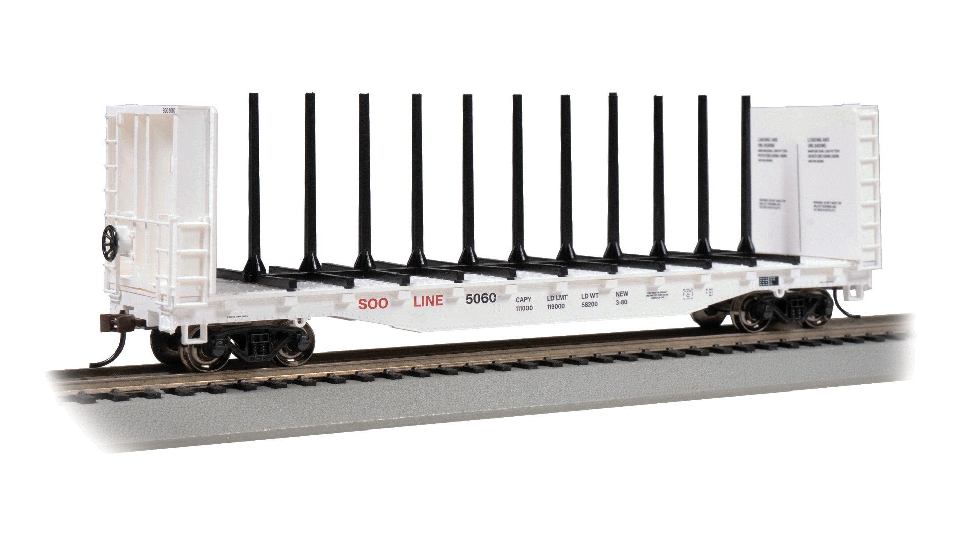 HO Scale 52' Center-beam Flatcar - Soo Line #5060. Center-beam cars are specialty cars designed for carrying building supplies such as cut wood, lumber, or drywall sheets. They are essentially bulkhead flatcars that have been reinforced with additional central supports for the side-loading of bulk materials. Performs best on 15' radius curves or greater.