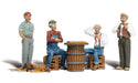 Two men sit at an old whiskey barrel playing checkers. One scratches his head, trying to decide his next move, while the other waits. A man smokes a pipe and another observes the game, with his hands in his pockets. An old hound dog flops down to rest, his tongue hanging out.
