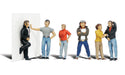 A cool couple stands together, arms entwined, while the man fixes his hair. Another couple stands together: his arms are crossed and her hand rests on her hip. One man leans with his hand on the wall. Another man adjusts his leather jacket.
