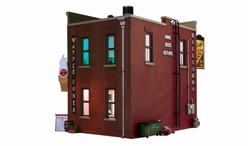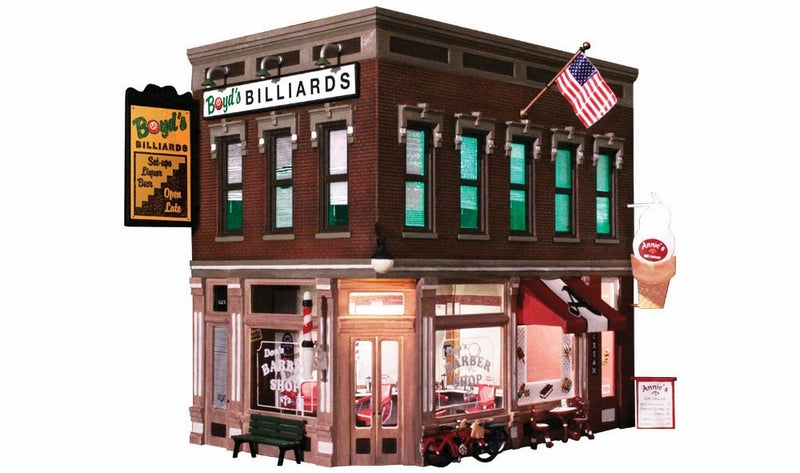 The Corner Emporium is an old-time three-in-one corner store. There's a barber shop, pool hall, and an ice cream and coffee shop. There are loads of details to help set your scene. Details include bicycles signage, barber shop pole, flag, awnings, posters, decals, a parlor table with two chairs, and many more! This building also includes interior lights on both floors and an interior printed scene. See photos for footprint.