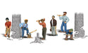 One man is crouching down to chop, one is taking a full swing, one man is at the end of his swing. One man is resting his legs beside an ax, on a stump, one man is holding his hat in one hand and an ax in another and the last man is resting his ax over his shoulder.